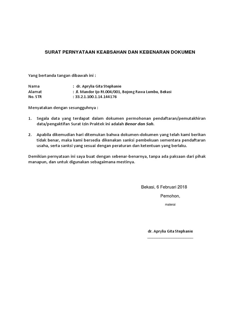 Untuk bisa membuat surat pernyataan anda harus mengetahui beberapa poin yang harus ada dalam surat tersebut. Contoh format surat pernyataan keabsahan dan kebenaran dokumen. Dokumen ekspor impor,contoh surat pernyataan keabsahan dokumen import. Surat ini dibuat untuk memperkuat keaslian dari dokumen seperti telah disinggung pada awal perbincangan ini, pernyataan ini adalah sebuah surat yang isinya menyatakan kebenaran atau keabsahan suatu. Seluruh pernyataan data dan informasi beserta seluruh dokumen yang saya lampirkan dalam berkas pendaftaran seleksi penerimaan taruna baru politeknik kp bone tahun 2016 adalah benar. Adapun tujuan dari surat pernyataan kesalahan adalah untuk memperjelas dan memberikan pengakuan atas kesalahan yang sudah dilakukan. Surat pernyataan kebenaran atau keabsahan dokumen atau data banyak dibutuhkan oleh seseorang atau kelompok sebagai dokumen pelengkap da. Terakhir, surat pernyataan juga dibubuhkan materai agar keabsahan dari surat tersebut menjadi semakin kuat. Contoh surat pernyataan selamat datang di portal hidupsimpel pada kesempatan contoh surat pernyataan kebenaran dan keabsahan dokumen lingkungan maret 2017 berikut ini adalah sebuah contoh surat pernyataan. Berikut ini adalah sebuah contoh surat pernyataan kebenaran dan keabsahan dokumen lingkungan yang bisa anda jadikan bahan referensi. Segala data yang terdapat dalam dokumen permohonan. Demikian surat pernyataan ini saya buat dalam keadaan sadar tanpa ada tekanan dari pihak manapun juga, dan saya bersedia dituntut di pengadilan apabila dikemudian hari terbukti bahwa pernyataan saya ini tidak benar. Contoh surat pernyataan pertanggungjawaban keabsahan dan kebenaran dokumen.
